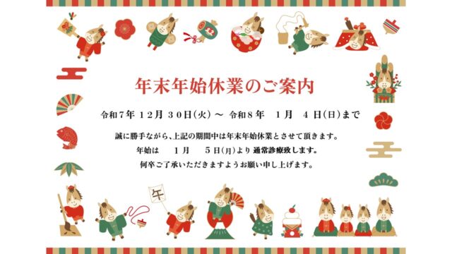 年末年始は、12月30日~1月4日まで休診とさせていただきます。
