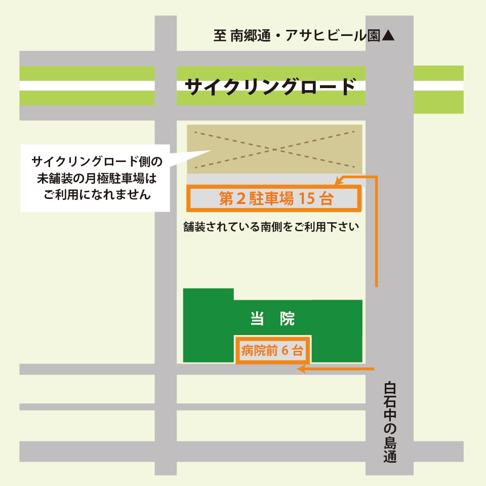病院敷地内6台、第2駐車場15台 ※場所がご不明の際はお気軽にお問い合わせください。